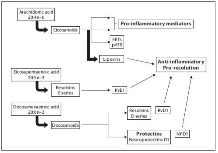 EPA和DHA經(jīng)代謝產(chǎn)生消散素(Resolvins)和保護素(Protections)。實驗研究證實,消散素和保護素在關(guān)節(jié)炎、結(jié)腸炎、哮喘等多種炎性疾病中發(fā)揮重要的抗炎作用 。例如,resolvin E1,resolvin D1和protectin D1能抑制浸潤性中性粒細胞的細胞遷移,從而減輕局部炎癥。此外,resolvin D1和protectin D1還能抑制TNF-α and IL-1β的產(chǎn)生,從而減弱炎癥反應(yīng)。