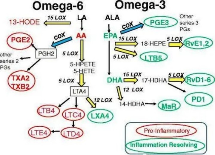 Omega-6 脂肪酸促進炎癥的發(fā)生,引起身體的“失火”;Omega-3 脂肪酸則相反,緩解并抑制炎癥,預(yù)防重疾,二者因為存在共用同工酶,所以兩者是代謝抑制關(guān)系。WHO專家研究發(fā)現(xiàn),缺少Omega-3脂肪酸是導(dǎo)致高血壓、心臟病、癌癥等的重要誘因之一;通過增加膳食中Omega-3脂肪酸含量,能有效減少全身性慢性炎癥。