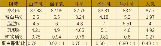 不同哺乳動物乳汁營養成分