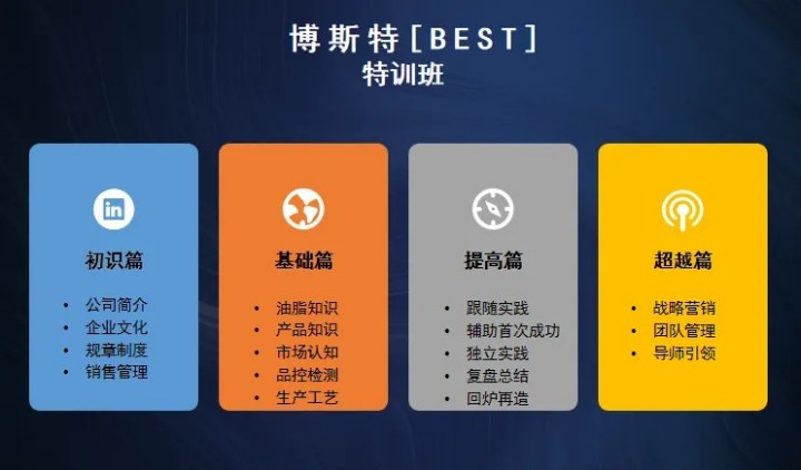 致力于通過為期一年多的專項系統(tǒng)培訓,讓新入職的業(yè)務員領(lǐng)悟企業(yè)文化、熟悉公司、掌握產(chǎn)品專業(yè)知識、認知市場、目標客戶心理特點、銷售團隊協(xié)作等,最終使他們成為一名優(yōu)百特銷售精英。