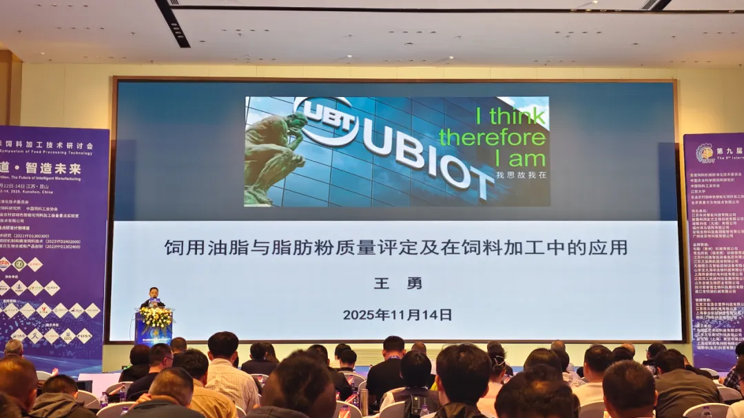 除了展區互動,優百特更以學術分享為紐帶,搭建技術傳播橋梁。11 月 14 日下午,優百特總工程師王勇如期帶來《飼用油脂與脂肪粉質量評定及飼料加工中的應用》主題報告,從油脂質量評定方法、脂肪粉加工工藝優化、功能性脂肪酸應用場景等維度,深入解析如何通過精細化管控提升脂肪利用率 10%-30%,既解決腹瀉、脂肪肝等養殖難題,又降低飼料成本與資源浪費,為行業提供兼具科學性與實操性的解決方案,報告引發全場強烈共鳴。