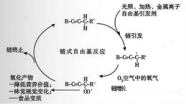 油脂自動氧化是典型的游離基反應。此反應分為三個階段:鏈的引發、傳遞和終止。